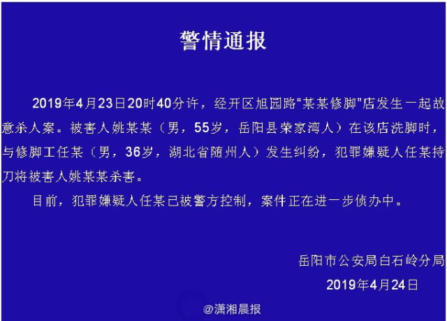 ![]() 4 月 24 日,岳阳市公安局白石岭分局发布通报称:2019 年 4 月 23 日 20 时 40 分许,经开区旭园路 " 某某修脚 " 店发生一起故意杀人案。被害人姚某某(男,55 岁,岳阳县荣家湾人)在该店洗脚时,与修脚工任某(男,36 岁,湖北省随州人)发生纠纷,犯罪嫌疑人任某持刀将被害人姚某某杀害。 目前,犯罪嫌疑人任某已被警方控制,案件正在进一步侦办中。 潇湘晨报记者从岳阳官方了解到,死者姚某某,系岳阳县原政府办副主任姚海洋。公开资料显示,姚海洋 1963 年 5 月出生,岳阳县原麻塘镇人,1984 年 9 月加入中国共产党,1983 年 5 月参加工作,中共岳阳市第五次代表大会代表,岳阳市第七届人大代表。历任岳阳县原康王乡党委副书记、党委书记,岳阳县政法委副书记、常务副书记,岳阳县交通局党委书记、局长等职务。2016 年 5 月至 2016 年 11 月任岳阳县东洞庭湖河道采砂管理局党组书记、局长,2016 年 12 月任岳阳县政府办副主任。 2017 年 2 月 22 日,中国共产党新闻网讯:岳阳县政府办副主任姚海洋涉嫌严重违纪,目前正接受组织调查。 2018 年 1 月,中国纪检监察报报道称,时任岳阳县政府办副主任、东洞庭湖河道采砂管理局局长姚海洋利用职务上的便利伙同亲属、他人违规在涉砂企业及挖砂船中入股分红,向涉砂企业高价转让快艇牟利等事实被查清。于 2017 年 5 月被开除党籍、开除公职,移送司法机关处理。 2010 年 8 月份,时任岳阳县交通局局长的姚海洋曾因在电话中大骂市民引发轩然大波,被网民称为 " 骂娘局长 "。 |