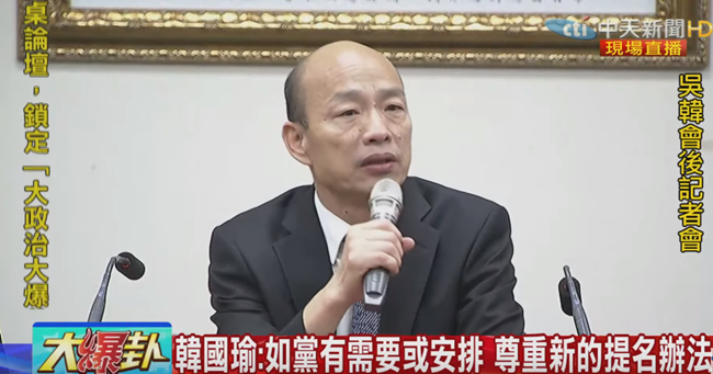 韩国瑜4月30日参加“吴韩会”后的新闻发布会(台媒截图) 综合台媒消息,韩国瑜4月30日参加与国民党主席吴敦义的会谈。在会后记者会上,他发表四点声明提到,自己在会中和吴敦义等人进行会谈并达成共识,国民党在2020选举中一定要团结,但身为高雄市市长,韩国瑜自己身上负有高雄市市民的期待,没有办法参加国民党党内初选。 此外,韩国瑜还表示,2020国民党一定要团结,如果中央党部以及中常对党内初选提出其他方式,有新的提名办法等,他予以尊重。 对韩国瑜在此次记者会上的表态,台湾“中时电子报”称,外界认为这意味着韩国瑜接受被动征召。台湾“东森新闻网”则称,国民党秘书长曾永权已告知韩国瑜,国民党最快将在5月8日的中常会上通过“特别提名办法”,韩听后表示尊重党或中常会的安排。 韩国瑜“吴韩会”后四点声明如下: 一、感谢吴敦义提名当高雄市党部主委和竞选高雄市长; 二、(吴敦义、韩国瑜)两人都深切认为2020一定要团结,集中一切力量,保护“中华民国”; 三、针对2020台湾地区领导人选举党内初选民调,自己身为高雄市长,肩膀上有市民期待,无法参加; 四、如果(国民党)中常会有其他方式需要自己来做各种安排,甚至民调等等,都予以尊重。