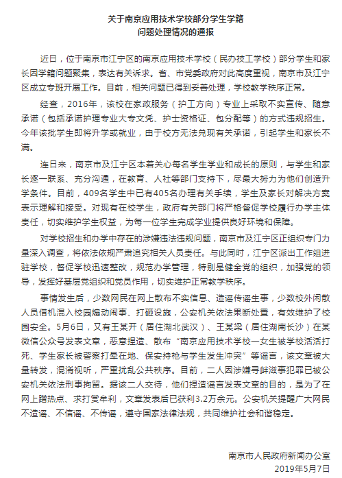 南京发布微信公号通报图 经查,2016年,该校在家政服务(护工方向)专业上采取不实宣传、随意承诺(包括承诺护理专业大专文凭、护士资格证、包分配等)的方式违规招生。今年该批学生即将升学或就业,由于校方无法兑现有关承诺,引起学生和家长不满。 连日来,南京市及江宁区本着关心每名学生学业和成长的原则,与学生和家长逐一联系、充分沟通,在教育、人社等部门支持下,尽最大努力为他们创造升学条件。目前,409名学生中已有405名办理有关手续,学生及家长对解决方案表示理解和接受。对现有在校学生,政府有关部门将严格督促学校履行办学主体责任,切实维护学生权益,为每一位学生完成学业提供良好环境和保障。 对学校招生和办学中存在的涉嫌违法违规问题,南京市及江宁区正组织专门力量深入调查,将依法依规严肃追究相关人员责任。与此同时,江宁区派出工作组进驻学校,督促学校迅速整改,规范办学管理,特别是健全党的组织,加强党的领导,发挥好基层党组织和党员作用,切实维护正常教学秩序。 事情发生后,少数网民在网上散布不实信息、造谣传谣生事,少数校外闲散人员借机混入校园煽动闹事、打砸设施,公安机关依法果断处置,有效维护了校园安全。5月6日,又有王某开(居住湖北武汉)、王某梁(居住湖南长沙)在某微信公众号发表文章,恶意捏造、散布“南京应用技术学校一女生被学校活活打死、学生家长被警察打晕在地、保安持枪与学生发生冲突”等谣言,该文章被大量转发,混淆视听,严重扰乱公共秩序。目前,二人因涉嫌寻衅滋事犯罪已被公安机关依法刑事拘留。据该二人交待,他们捏造谣言发表文章的目的,是为了在网上蹭热点、求打赏牟利,文章发表后已获利3.2万余元。公安机关提醒广大网民不造谣、不信谣、不传谣,遵守国家法律法规,共同维护社会和谐稳定。 南京市人民政府新闻办公室 2019年5月7日 (原题为《关于南京应用技术学校部分学生学籍问题处理情况的通报》) |