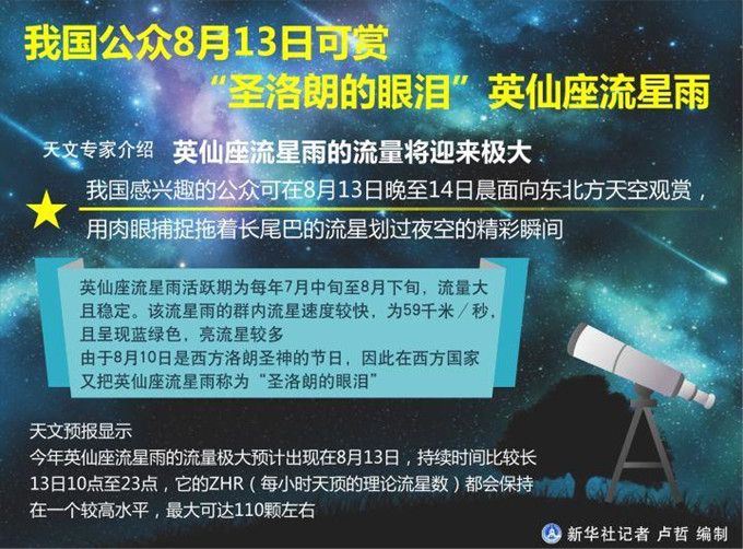 新华社天津8月11日电(记者周润健)向流星许个心愿,是件很浪漫的事。这样的机会来了。天文专家介绍,8月13日,作为北半球三大流星雨之一,英仙座流星雨的流量将迎来极大,我国感兴趣的公众可在13日晚至14日晨面向东北方天空观赏,用肉眼捕捉拖着长尾巴的流星划过夜空的精彩瞬间。 天津市天文学会副理事长李梅丛介绍,英仙座流星雨活跃期为每年7月中旬至8月下旬,流量大且稳定。该流星雨的群内流星速度较快,为59千米/秒,且呈现蓝绿色,亮流星较多。由于8月10日是西方洛朗圣神的节日,因此在西方国家又把英仙座流星雨称为“圣洛朗的眼泪”。近年英仙座流星雨一直相对稳定,天顶流量每小时为60颗至100颗。 天文预报显示,今年英仙座流星雨的流量极大预计出现在8月13日,持续时间比较长。13日10点至23点,它的ZHR(每小时天顶的理论流星数)都会保持在一个较高水平,最大可达110颗左右。 “不利的条件是当日恰逢农历七月十三,距离满月只有两天,观测时会受到强烈的月光干扰,一些暗弱的流星将无法观测到,但一些超亮的火流星依然会光彩夺目。好在次日凌晨3时以后,月亮就会下落,因此后半夜观测更加适宜。”李梅丛说。