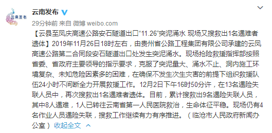 云南发布微博12月2日消息,2019年11月26日18时左右,由贵州省公路工程集团有限公司承建的云凤高速公路第二合同段安石隧道出口处发生突泥涌水。现场抢险救援指挥部按照省委、省政府主要领导的指示要求,克服了突泥量大、涌水不止、洞内施工环境复杂、未知危险因素多的困难,在确保不发生次生灾害的前提下组织救援队伍24小时不间断全力开展救援工作。12月2日下午16时50分许,在13名遇险失联人员中,再次搜救出1名遇难者遗体。目前,累计搜救出9名遇险失联人员,其中8人遇难,1人已转往云南省第一人民医院救治,生命体征平稳。现场仍有4名作业人员遇险失联,搜救工作继续有力有序推进。 (临沧市人民政府新闻办公室) (原题为《云县至凤庆高速公路安石隧道出口“11.26”突泥涌水 现场又搜救出1名遇难者遗体》)