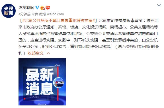 【#北京公共场所不戴口罩者重则将被拘留#】北京市司法局局长李富莹:按照北京市政府办公厅通知,宾馆、饭店、文化娱乐场所、商场超市、公共交通场站等人员密集场所的经营管理单位和地铁、公交等公共交通运营管理单位对未佩戴口罩的,应当进行劝阻。实践中,对不听从劝阻,甚至引发矛盾冲突的,由公安机关予以处罚,轻则处以警告,重则有可能被处以拘留。(总台央视记者何畅 胡亚利) |