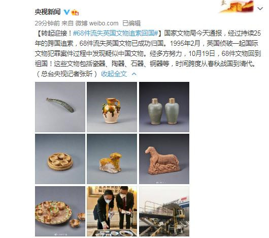 本文转自【央视新闻】; @央视新闻 11月18日消息,国家文物局今天通报,经过持续25年的跨国追索,68件流失英国文物已成功归国。1995年2月,英国侦破一起国际文物犯罪案件过程中发现疑似中国文物。经多方努力,10月19日,68件文物回到祖国!这些文物包括瓷器、陶器、石器、铜器等,时间跨度从春秋战国到清代。(总台央视记者张昕) ![]() ![]() ![]() ![]() ![]() |