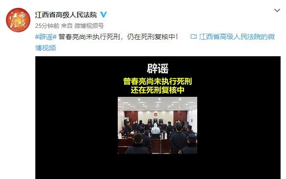 ![]() 4月20日,江西省高级人民法院官方微博发布辟谣信息:曾春亮尚未执行死刑,仍在死刑复核中! |