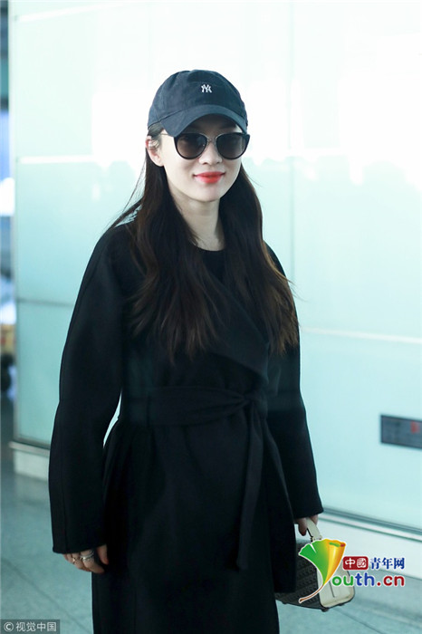 2018年11月17日,北京,霍思燕亮相机场,她身穿黑色大衣搭配棒球帽造型休闲中不失优雅,对镜头甜笑和粉丝聊天心情很好。