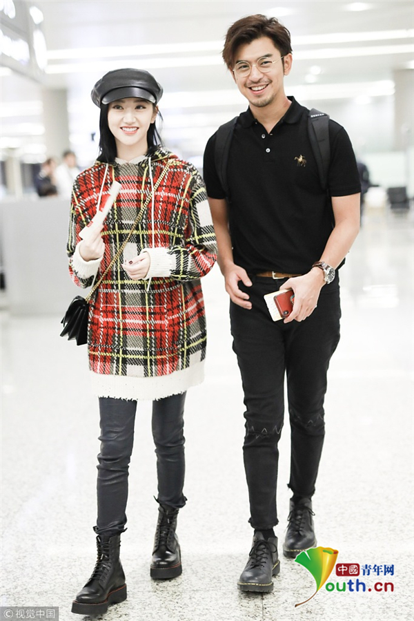 景甜与陈柏霖结伴离沪 同穿红色格纹默契十足