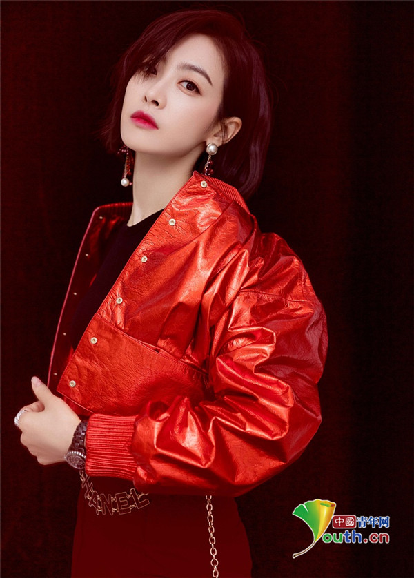 宋茜咬唇妆配亮红皮衣耀眼时髦 眼神犀利攻气足