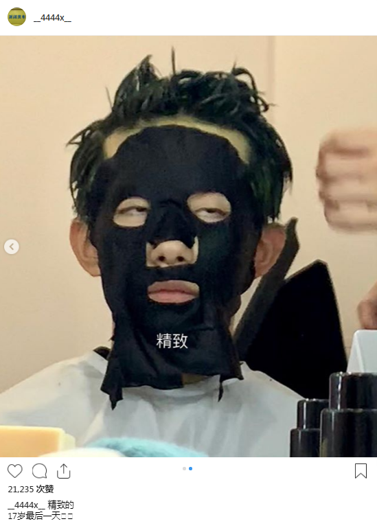 11月27日,易烊千玺在个人社交网站上分享了敷面膜照片,配文“精致的,17岁最后一天。”照片中,易烊千玺头发湿漉漉的向后梳,敷上黑色面膜,眼神搞怪。粉丝纷纷评论“怎么这么可爱呢”“大佬你这么放飞自我真的好吗?”