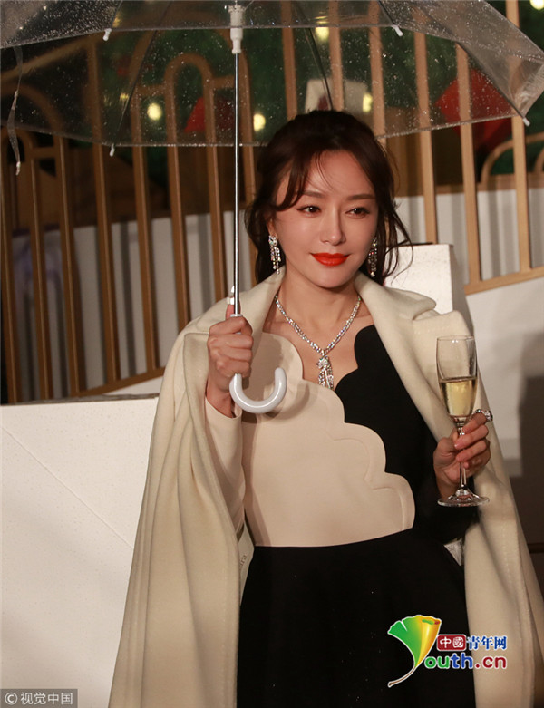 秦岚撑伞雪肤红唇美如画 优雅品香槟气质高贵迷人