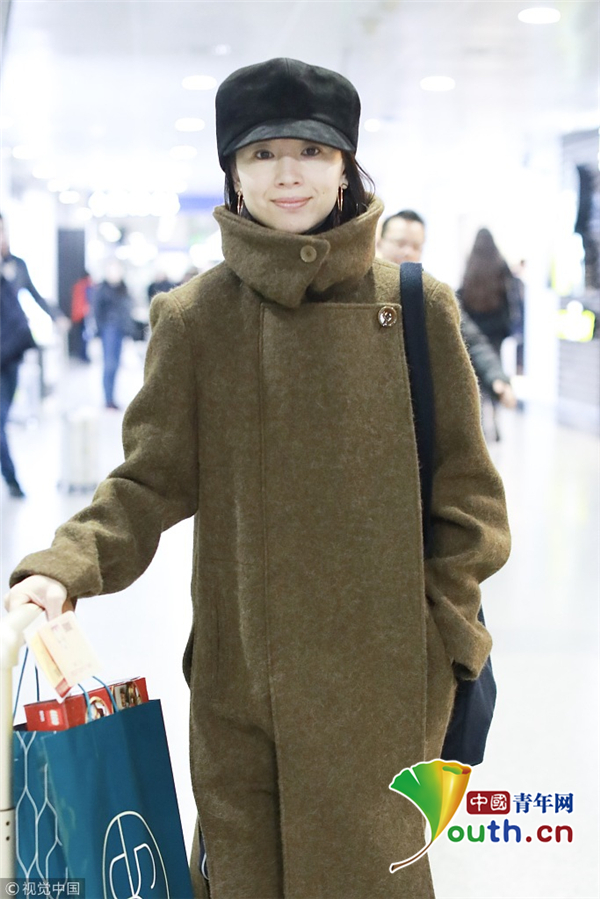 2018年12月29日,北京,董洁现身机场。董洁戴帽子穿呢子大衣自推行李箱, 皮肤白皙似少女,笑容浅浅温柔迷人。