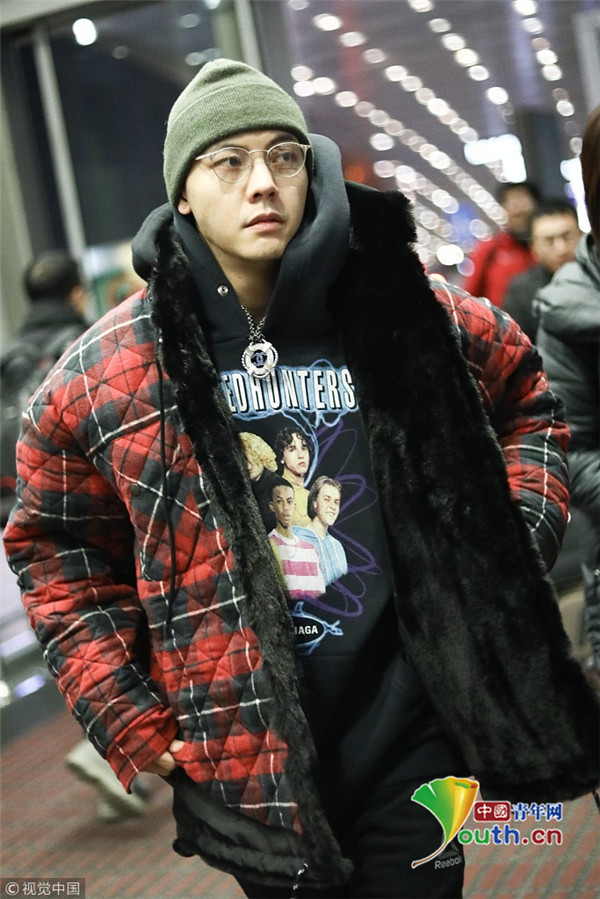 陈伟霆“戴绿帽”保暖启程 超大黑毛领造型潮酷