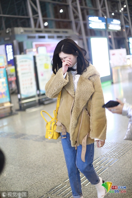 2019年1月18日,江疏影现身机场,从成都飞往北京。她刚刚参加完品牌活动就急匆匆搭机离开。她身穿羊羔毛外套认真过冬,揉眼难掩困意,不时低头浅笑魅力十足。