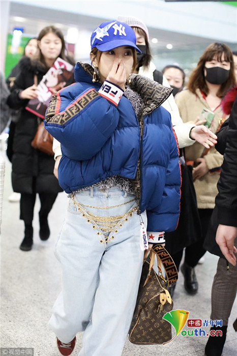 2019年1月21日,北京,蔡依林现身机场。她裹成“米其林”拎包疾走,依旧潮爆机场变“带货女王”,不停捏鼻子卖萌,获粉丝、保镖紧跟护驾。