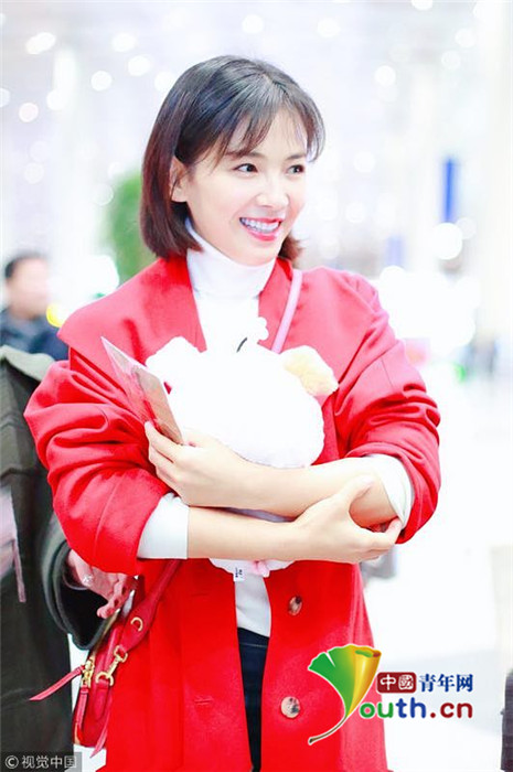 刘涛穿喜庆红装笑容满面 获粉丝送“小猪”心情大好
