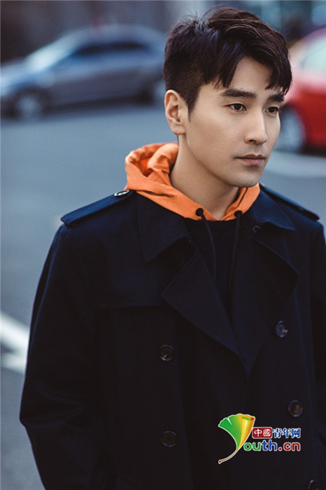 赵又廷穿深蓝色挺括风衣内搭亮橘色点缀的连帽卫衣,沉稳中赋予雅致的活力。双肩包实用又百搭,演绎都市男士的随性自然魅力气质。