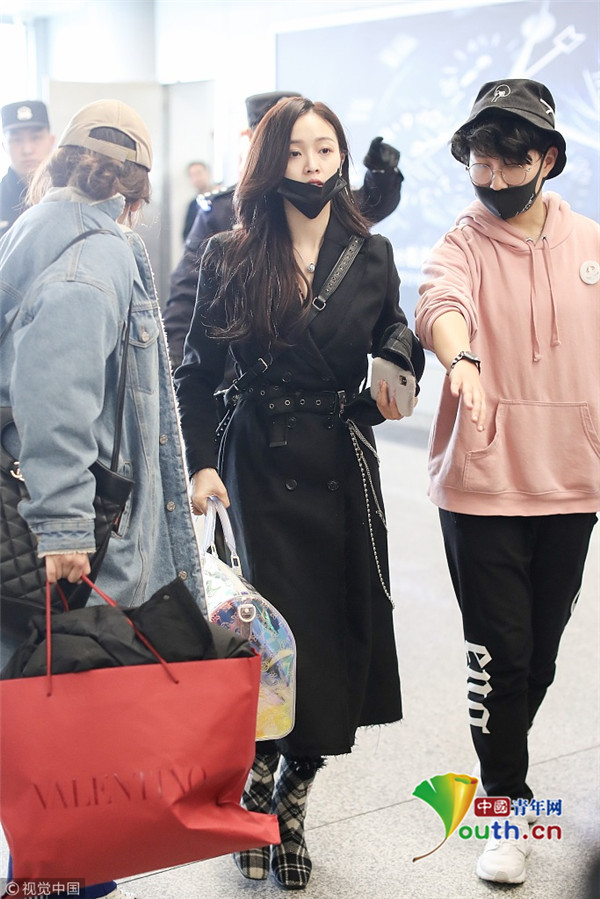 2019年2月24日,北京,吴宣仪现身北京机场,前往宁波参加《斗破苍穹》开机仪式。她身穿黑色时髦大衣配格纹靴帅气有型。