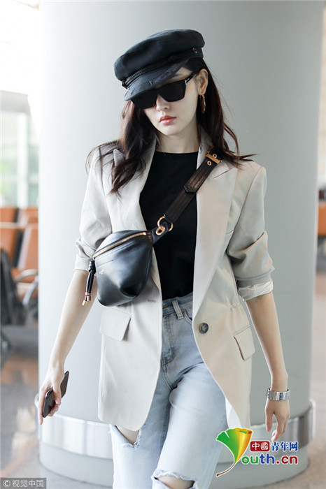 2019年3月13日,北京,张天爱现身机场。她穿破洞牛仔裤配小西装时尚感爆棚,架黑超戴黑色帽子酷帅有型,甩臂迈步似悠闲行走。
