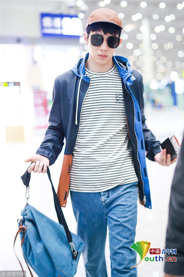 2019年4月9日,北京,井柏然现身机场。他穿条纹衫配阔腿牛仔裤文艺范满满,叠戴双帽潮流感十足,架黑超迈步带风文艺雅痞范。
