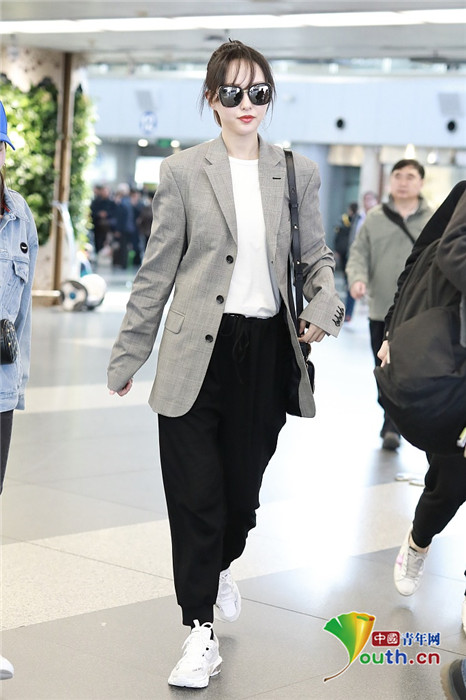 近日,唐嫣现身北京机场,她扎着马尾戴墨镜,一身西装干练又潇洒,嘴角露出微笑又甜又酷。