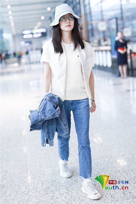 2019年4月29日,上海,江疏影现身机场。她戴蓝色渔夫帽穿一身牛仔套装青春靓丽,低头疾走时是“气质女神”,露甜笑秒变邻家小姐姐亲和力爆棚。