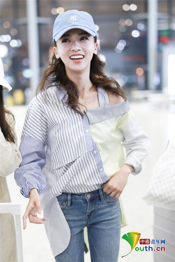 2019年5月7日,上海,吴谨言现身机场。她身穿蓝色条纹衬衫,小秀香肩,清爽又阳光,与粉丝互动笑到不能自已,相当亲和。
