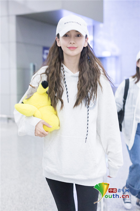 2019年5月20日,四川成都,Angelababy身着白色卫衣,黑色紧身裤一身休闲装扮现身成都机场,获粉丝热情接机,拿着熊猫玩偶爱不释手,一路合影签名不停歇,有粉丝在前面合影差点摔倒,baby第一反应伸手接住她。