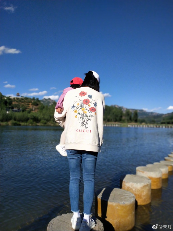 朱丹晒亲子时光 2岁小小丹农舍玩水捡石子模样超可爱