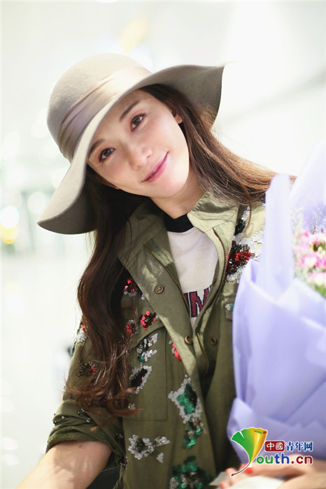 2019年5月22日,桂林,林志玲现身机场。她穿着工装上衣和牛仔裤,头戴超大宽毡帽,一出闸便获粉丝送花,见记者跟拍歪头露甜笑,亲和力爆棚。