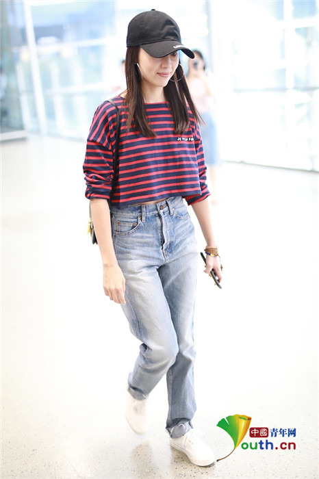 董洁条纹上衣+仔裤时髦又减龄 清纯甜笑美成少女