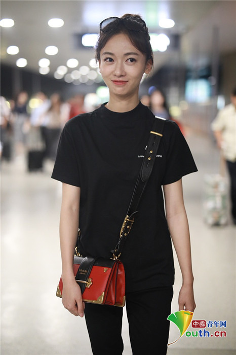 2019年6月12日,上海,吴谨言现身机场。她歪头灿笑俏皮可爱似明媚少女,all black穿搭更显身材娇小,斜挎红色小包增加活力点缀。