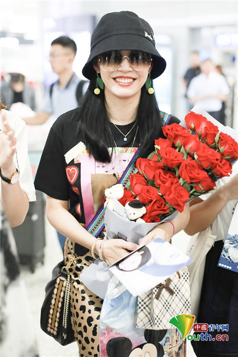 2019年6月13日,上海,姚晨现身机场。她穿着黑T搭配豹纹包臀裙显出纤细身材,喜提粉丝赠送的长鼻子抱枕放在手里仔细端详,获粉丝鲜花簇拥大展迷人笑容。