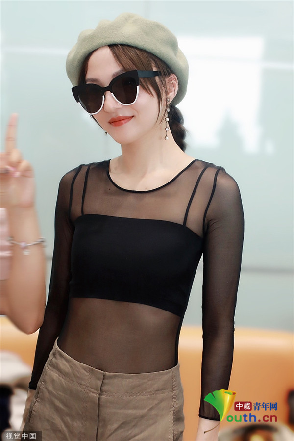 2019年7月14日,北京,张韶涵现身机场。她身穿黑色上衣大秀小蛮腰,戴贝雷帽穿阔腿裤时髦满分,笑容灿烂心情靓。