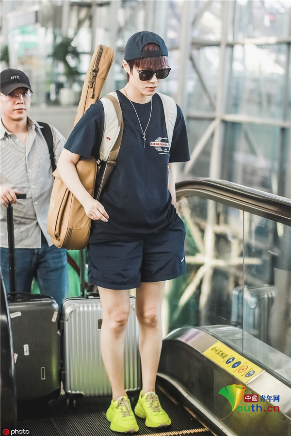 2019年7月18日,近日李宇春现身机场,她身穿黑色T恤配运动短裤,脚踩荧光色运动鞋,反戴棒球帽+墨镜星范足。