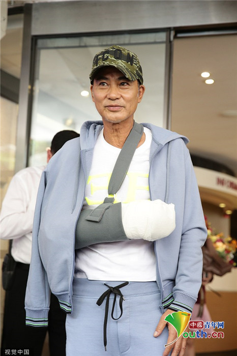 2019年7月24日,香港,任达华出院。他身穿蓝色运动外套走出医院,头戴鸭舌帽,受伤的右手则套上白色护臂带,面带笑容,精神状态非常好。