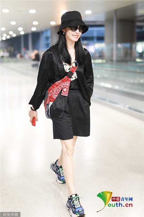 2019年7月24日,上海,姚晨现身机场,她头戴渔夫帽面戴黑超穿黑色连体裤显干练,拼色背包吸睛,对镜展露标志性微笑,为粉丝签名亲和力满分。