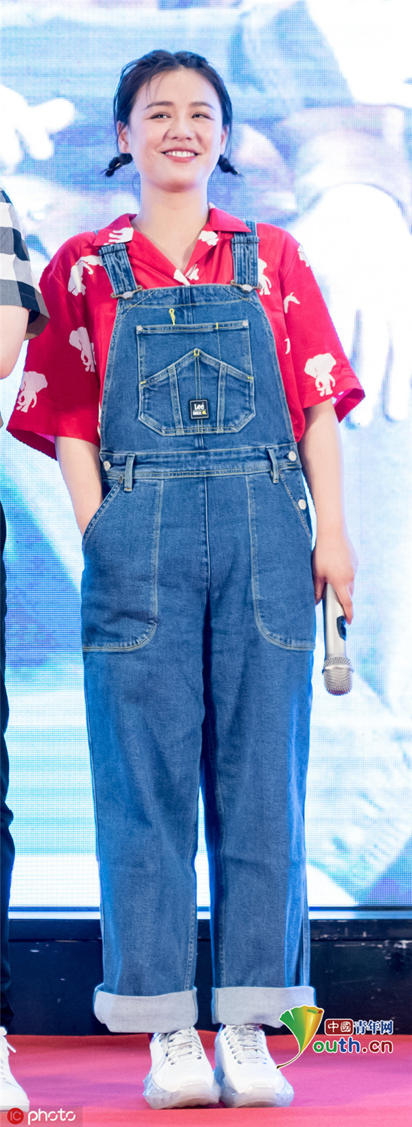 7月28日,上海,马思纯亮相电视剧《加油,你是最棒的》开播发布会。身穿红色印花衬衫+牛仔背带裤显青春活力。