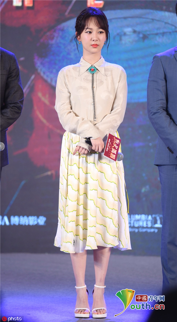 7月28日,北京,杨紫亮相电影《烈火英雄》首映发布会。杨紫身穿燕麦色衬衫搭黄色印花半身裙显淑女气质。
