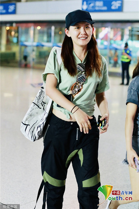 2019年8月12日,北京,热依扎现身机场。她穿绿T配黑裤走酷帅风,下摆打结露腰显穿搭小心机,双手合十谦逊有礼,机场频打哈欠难掩困意仍不忘微笑与粉丝合影显亲和。