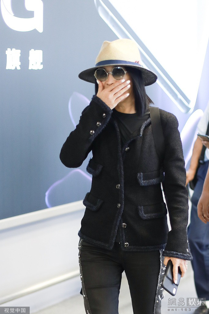 2019年9月16日,上海,那英现身机场。她头戴草编遮阳帽墨镜遮面十分时尚,身穿黑色英伦风外外套搭配个性牛仔裤酷范儿十足。面对镜头那英素颜捂嘴笑十分害羞。
