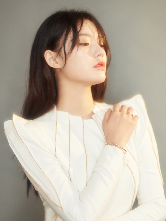 10月20日,林允亮相某活动,她身穿金色镶边白色礼服,别致的垫肩造型搭配披肩长发优雅又不失少女。