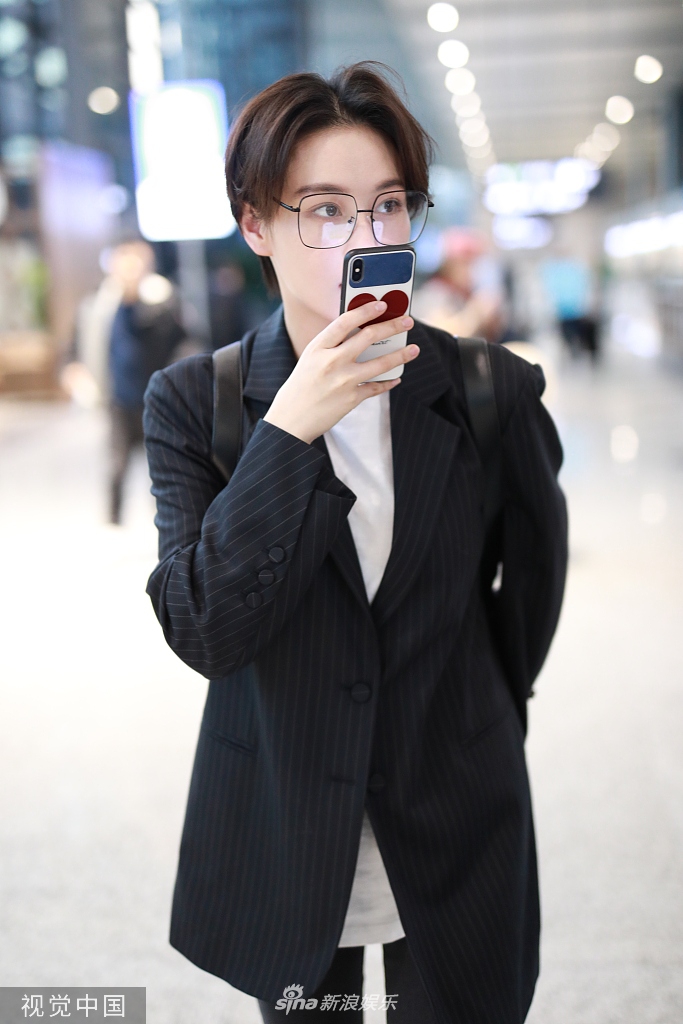 10月30日,张馨予现身机场。她换成短发后气质超A,穿条纹西装配皮靴酷劲十足,边走边玩手机潇洒有气场。