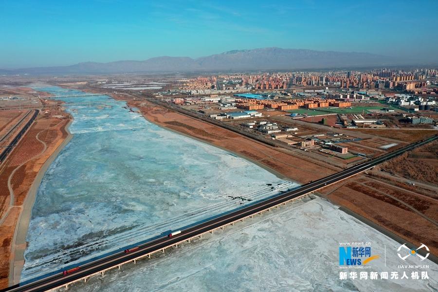 这是近日在甘肃省张掖市甘州区航拍的黑河风光。隆冬时节,清澈碧蓝的黑河河水结冰,从空中俯瞰宛如一条“银链”在大地蜿蜒。