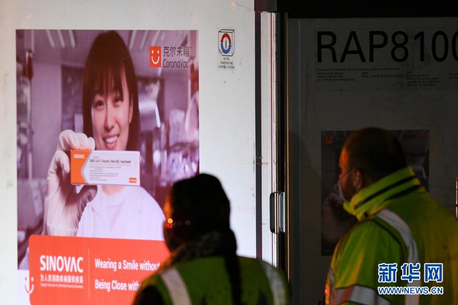 2月27日,在墨西哥首都墨西哥城国际机场,工作人员从飞机上卸下装有中国科兴新冠疫苗的温控集装箱。