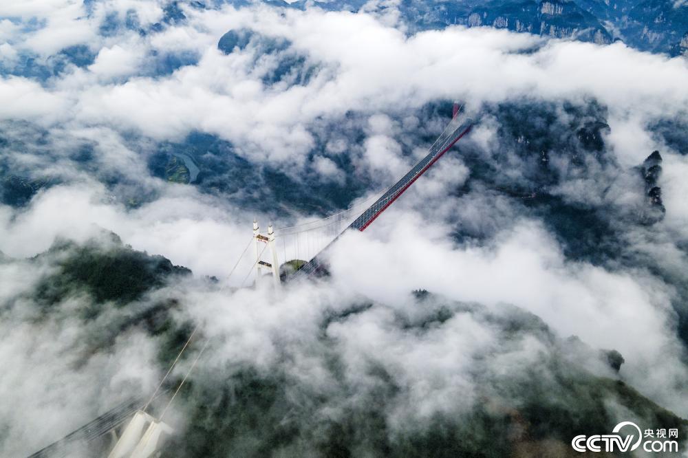 2021年3月11日,湖南湘西,吉首市矮寨镇矮寨特大悬索桥云雾缭绕,宛如仙境。当日,吉首市矮寨镇雨后初晴,矮寨特大悬索桥周边山峦间云雾缭绕,美不胜收。