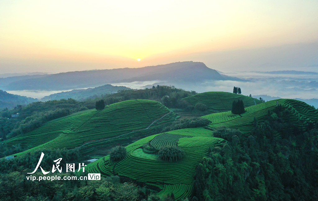 2021年3月23日,四川省泸州市纳溪区的茶山上云雾缥缈,在晨曦霞光的映衬下,纵横交错的茶垄风光旖旎,美如画卷。