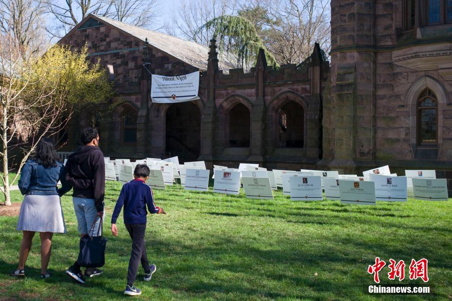 当地时间3月30日,民众在美国新泽西州普林斯顿大学摆放的新冠逝者纪念牌前,普林斯顿大学在校园草坪摆放纪念牌以纪念该校因新冠去世的人员和家属。
