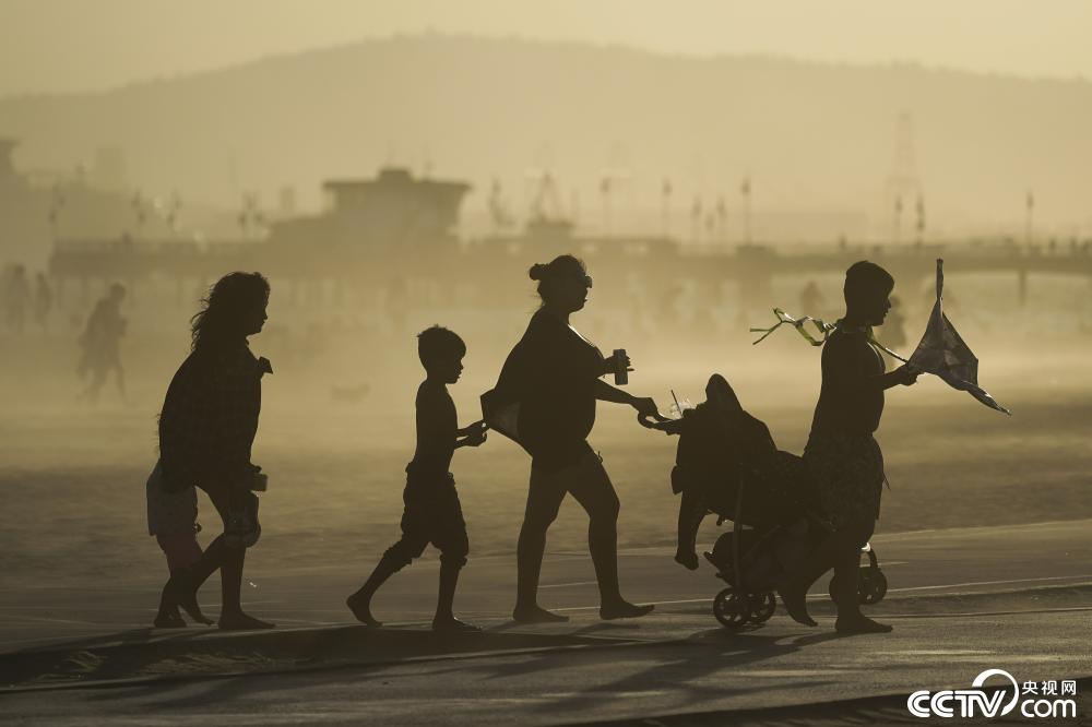 当地时间4月18日,美国加州海边大风卷起沙土,游客在漫天黄沙中出行。