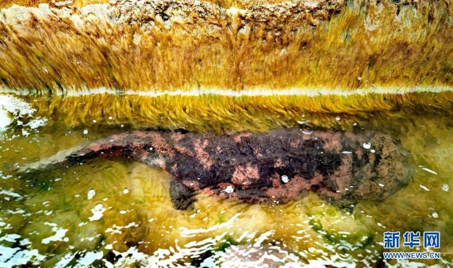 在泾河中发现的“娃娃鱼”(4月19日摄)。4月19日,河道治理工作人员在宁夏泾源县的泾河6号水坝发现一条“大鱼”,经动物专家确认,是国家二级重点保护野生动物中国大鲵,俗称“娃娃鱼”。