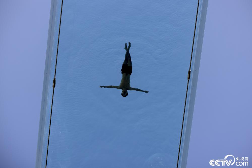 当地时间4月22日,模特们在位于伦敦西南部两座公寓楼之间的透明泳池里游泳。这座25米长的世界首个透明户外泳池被称为“空中泳池”,居民可以在10层高的建筑之间游泳,似在空中遨游。