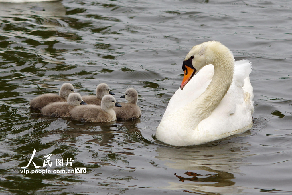 2021年4月24日,河北省邯郸市鸡泽县毛遂湿地公园内,出生不久的白天鹅宝宝跟随妈妈下湖游泳。